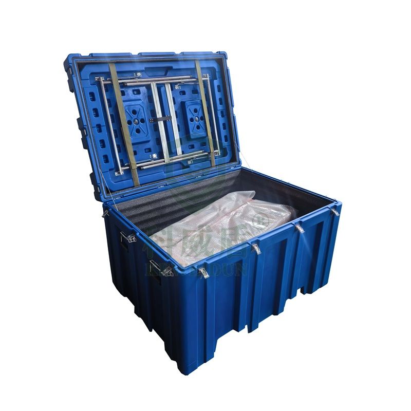 復合型高強度工程塑料LLDPE,顏色可定制。輸箱為上開蓋結構,箱體部分采用滾塑工藝一次成型,箱體裝有10個不銹鋼蝴蝶鎖扣、4個合頁,4個高強度塑料提手,2根上下蓋連接剛絲繩,箱體內有減震海綿,箱體可帶叉車位。上蓋可配置一張折疊式行軍桌。